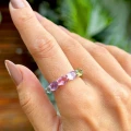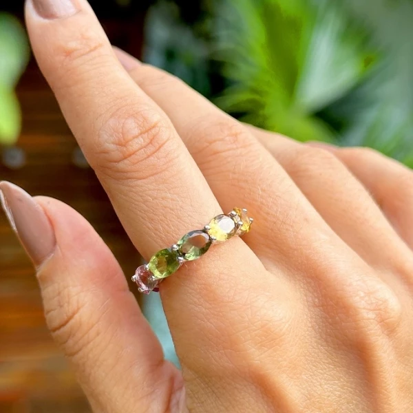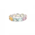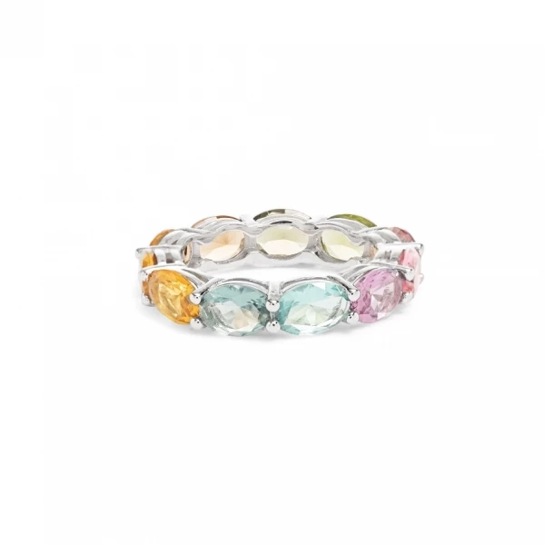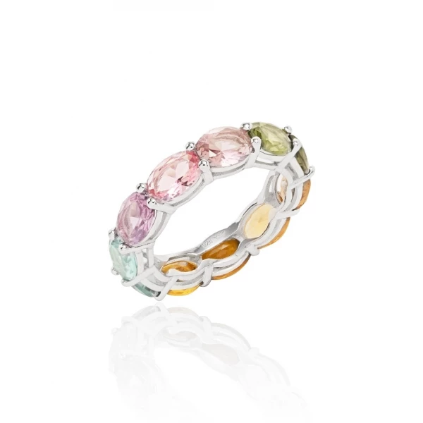 Anel em prata 925 (com banho de ródio) composto de dez cristais ovais, incluindo citrino, ametista topázio azul, morganita, peridoto, turmalina paraíba; com cravação em garras.
